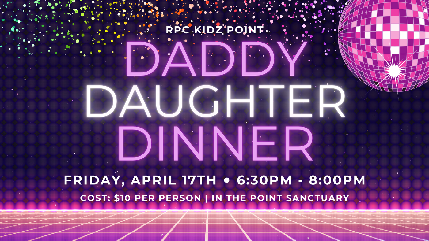 We are hosting a special event at RPC. The Daddy Daughter Dinner is scheduled for April 17th will be held in the Point Youth Sanctuary at 6:30pm. This event is for girls ages 5 years old to 12 years old and their fathers. The cost for the event is $10 per person.