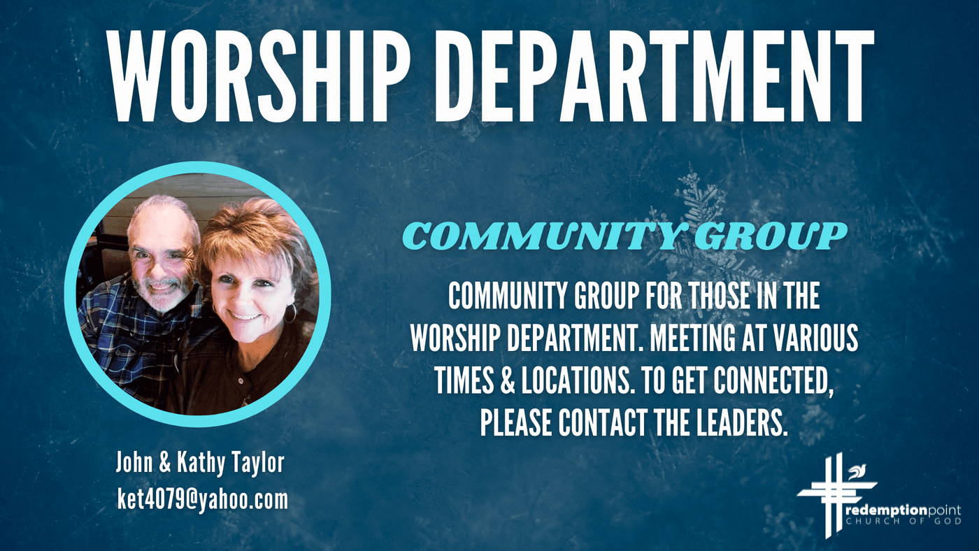 Worship Department Practices: Choir and Band Practice also happen after our Mid-Week Groups from 7:30pm-8:30 pm. For more information about getting involved with the Worship Department see Pastor Sharon Ballinger.